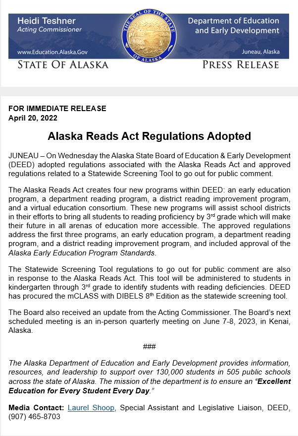 Alaska Reads Act Regulations Adopted